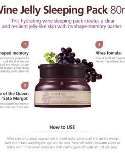 Wine Jelly Sleeping Pack Innisfree là loại mặt nạ đắp qua đêm, chiết xuất từ rượu vang với mùi thơm rất dễ chịu và thoải mái, mang lại cảm giác thật thư giãn sau một ngày làm việc căng thẳng.